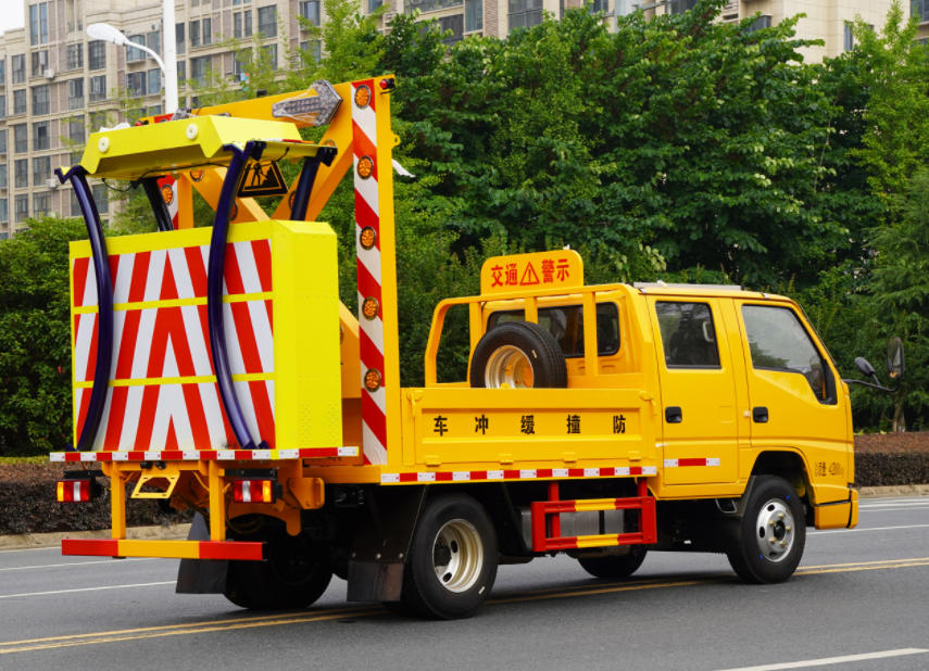 该车专用装置为:车载式缓撞装置,主要用于移动施工、临时性封闭车道或交通事故处理及抢险现场,降低城市道路施工、高速公路养护等作业中的安全问题.ABS系统型号:APG3550500A,ABS系统生产厂家:浙江亚太机电股份有限公司.侧/后部防护材料均为:Q235碳钢,侧防护采用螺栓连接,后防护采用焊接连接,后部防护截面尺寸(mm):100×50,后部防护离地高度(mm):420.选装后部及侧部样式,后部作业灯仅在作业时开启.随底盘选装驾驶室.选装货箱及防撞包外观;选装箱体侧面外观样式.选装后部防撞包展开样式. |